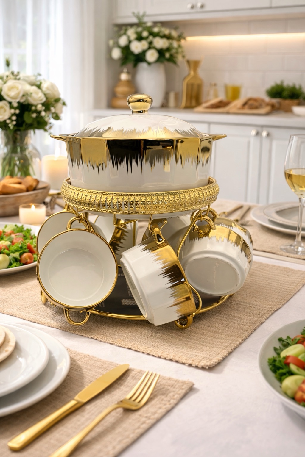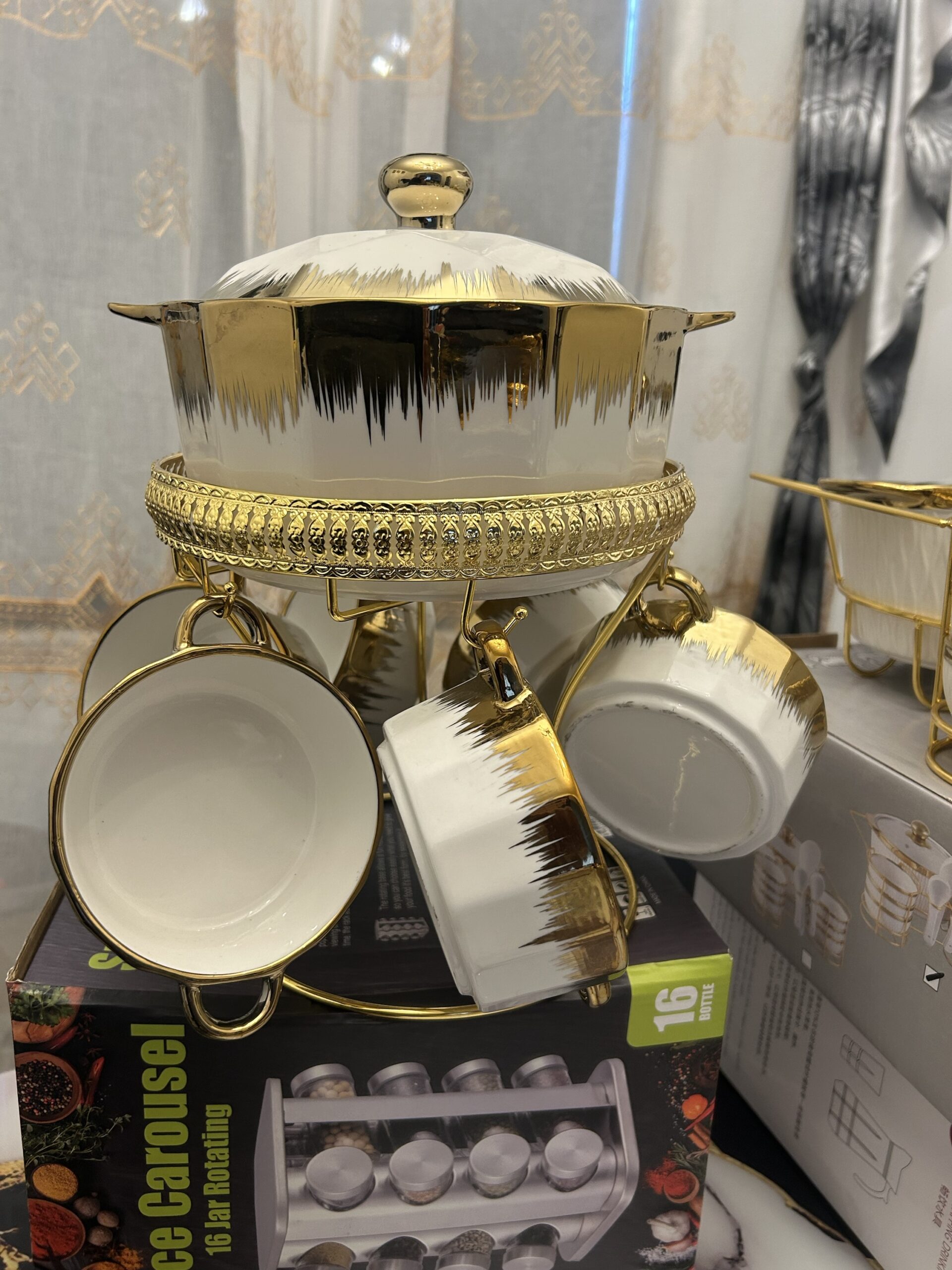 La soupière blanche avec bordure dorée et relief 3D est très jolie. Parfaite